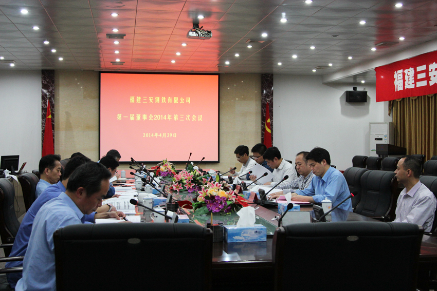 4月29日,我司召開三安鋼鐵第一屆董事會2014年第三次會議、2013年股東會,會議由黎立璋董事長主持,洪榮勇、張云仲、吳春海、楊江勇、歐陽哲等董事參加了會議,李德輝、廖溢昌、胡真明等列席會議。會議審議通過了《2013年度總經(jīng)理工作報告》、《2013年度董事會工作報告》、《2014年生產(chǎn)經(jīng)營計劃(草案)》等方案。
