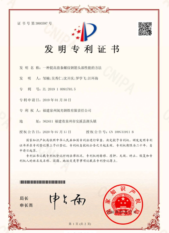 7月17日,我司的“一種提高盤條螺紋鋼筋頭部性能的方法”獲得發(fā)明專利授權,專利號為ZL 2019 1 0091793.5。這是我司繼2018年“一種棒材生產(chǎn)普通螺紋鋼中軋出口鐵型配置方法”首次獲得發(fā)明專利授權以來,再次獲得了發(fā)明專利授權。